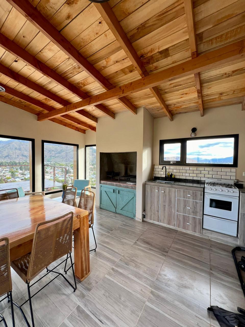 El alojamiento cuenta con vistas panorámicas, living-comedor luminoso, cocina completa equipada para estadías cortas o largas, parrilla integrada, deck exterior ideal para relajarse, pileta de verano (según temporada) y estacionamiento dentro del predio.